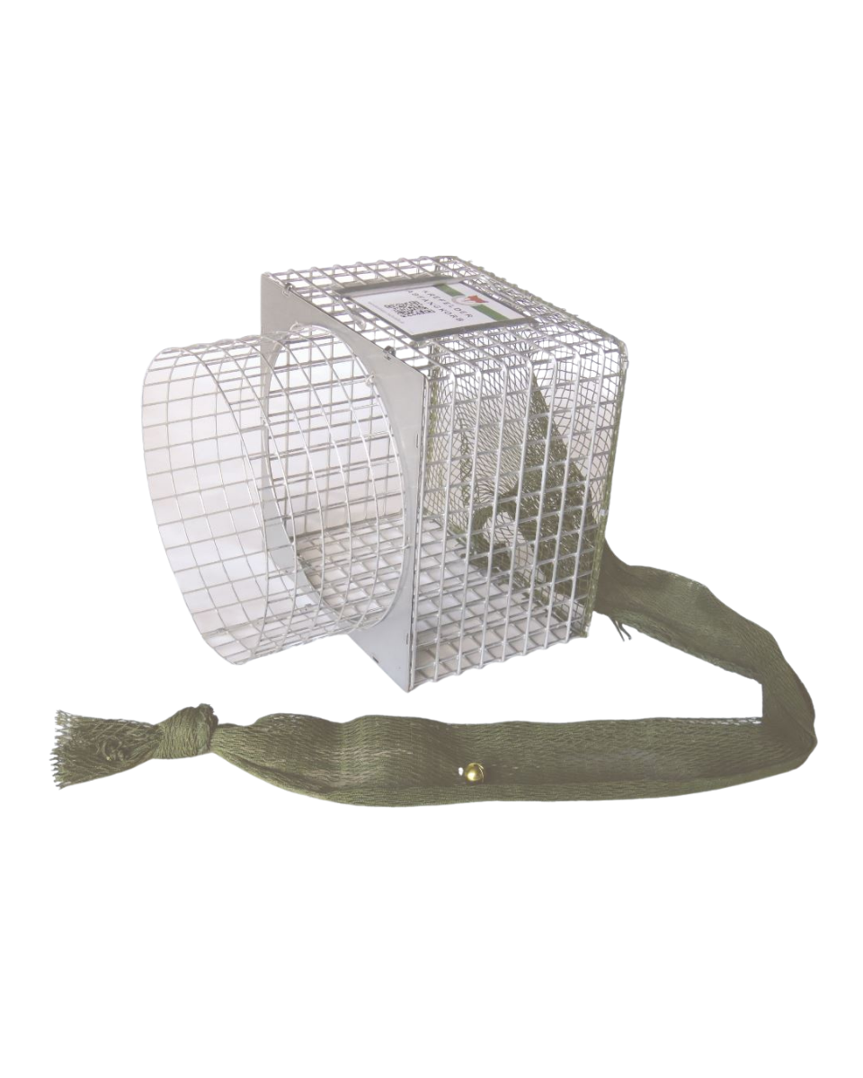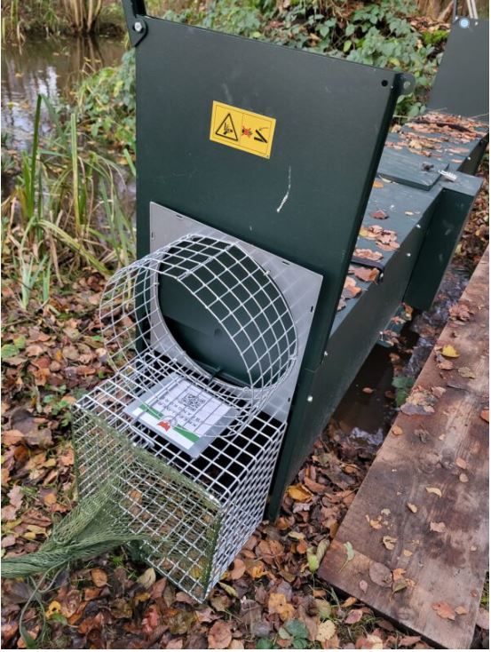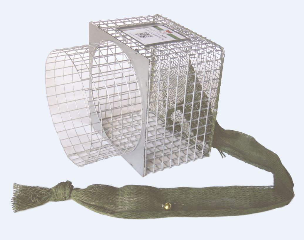 En lille klokke bag på nettet giver et akustisk signal, når et dyr er fanget.